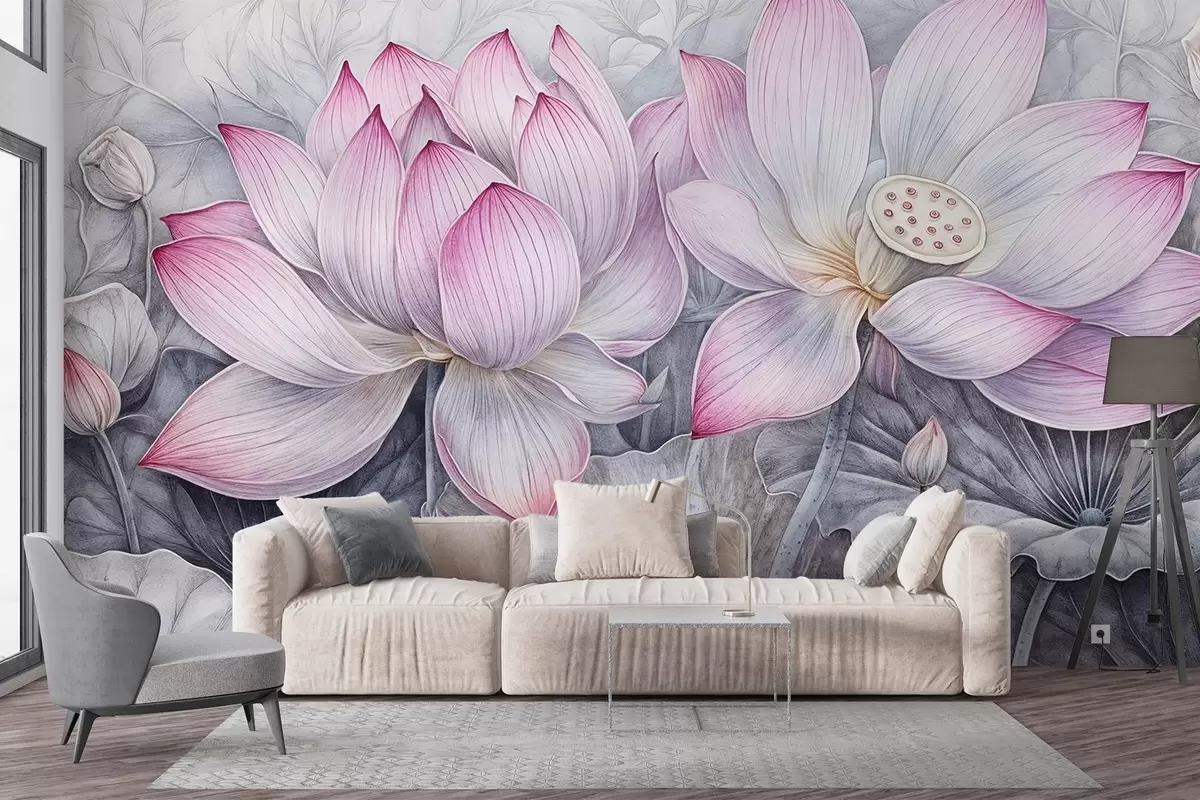 Fototapetai Keletas detalių tekstūruotų didelių rausvų lotoso žiedų su pilkai žaliais lapais ir stiebais šviesiame fone Nr. w08465