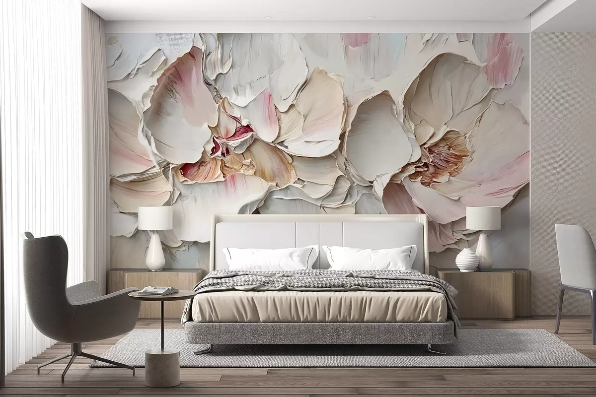 Fototapetai Švelnios, šviesiai rožinės spalvos gėlės su minkštais, sluoksniuotais žiedlapiais prislopintame, tekstūruotame fone impasto aliejinės tapybos imitacija Nr. w08467