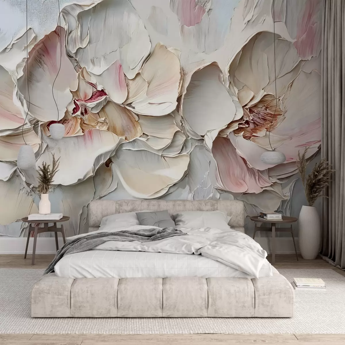 Fototapetai Švelnios, šviesiai rožinės spalvos gėlės su minkštais, sluoksniuotais žiedlapiais prislopintame, tekstūruotame fone impasto aliejinės tapybos imitacija Nr. w08467
