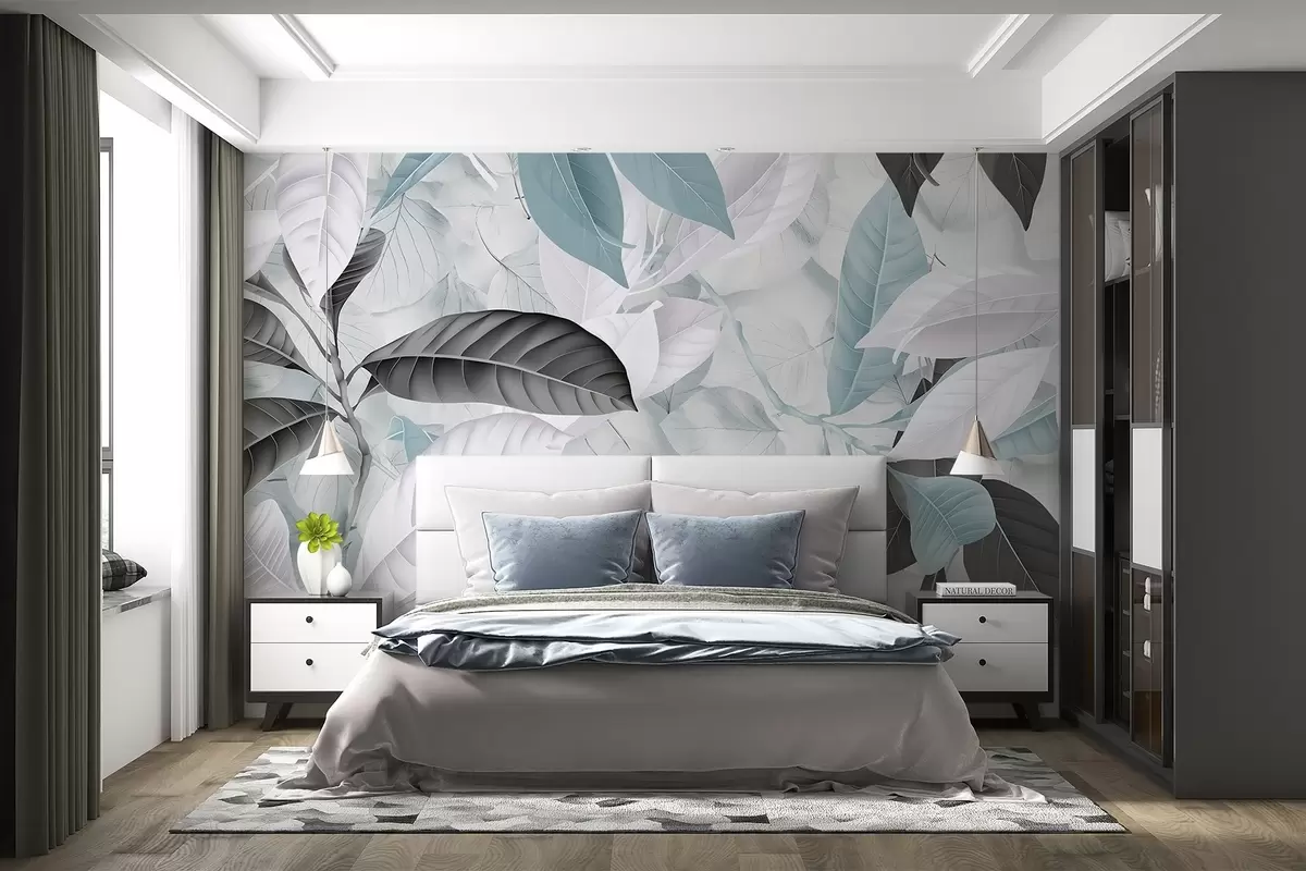 Fototapetai Didelis mėlynų ir pilkų lapų atspaudas šviesių lapų tekstūros fone, sukuriantis sodrų tropinį įspūdį Nr. w08468v1