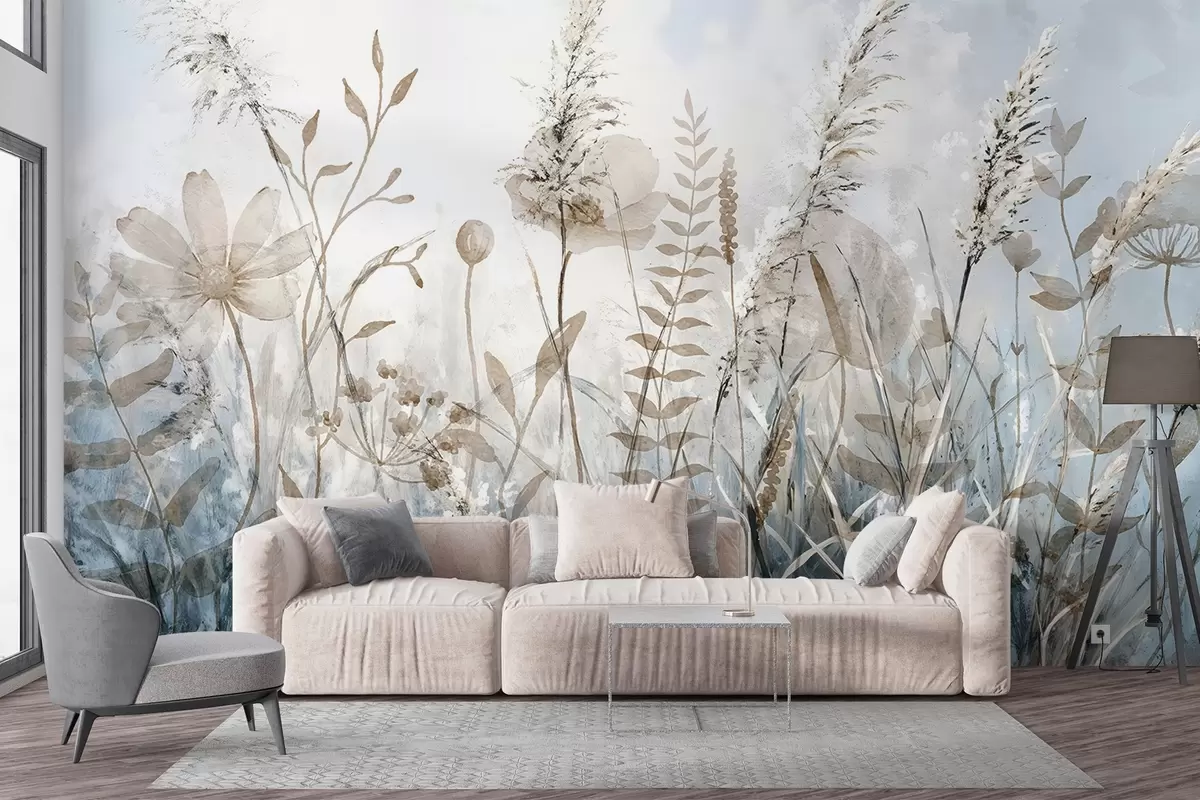 Fototapetai Aukštos žolės, natūralios lapijos ir augalų laukas su minkšta, išplaukusiomis tekstūromis migloto, debesuoto dangaus fone Nr. w08472