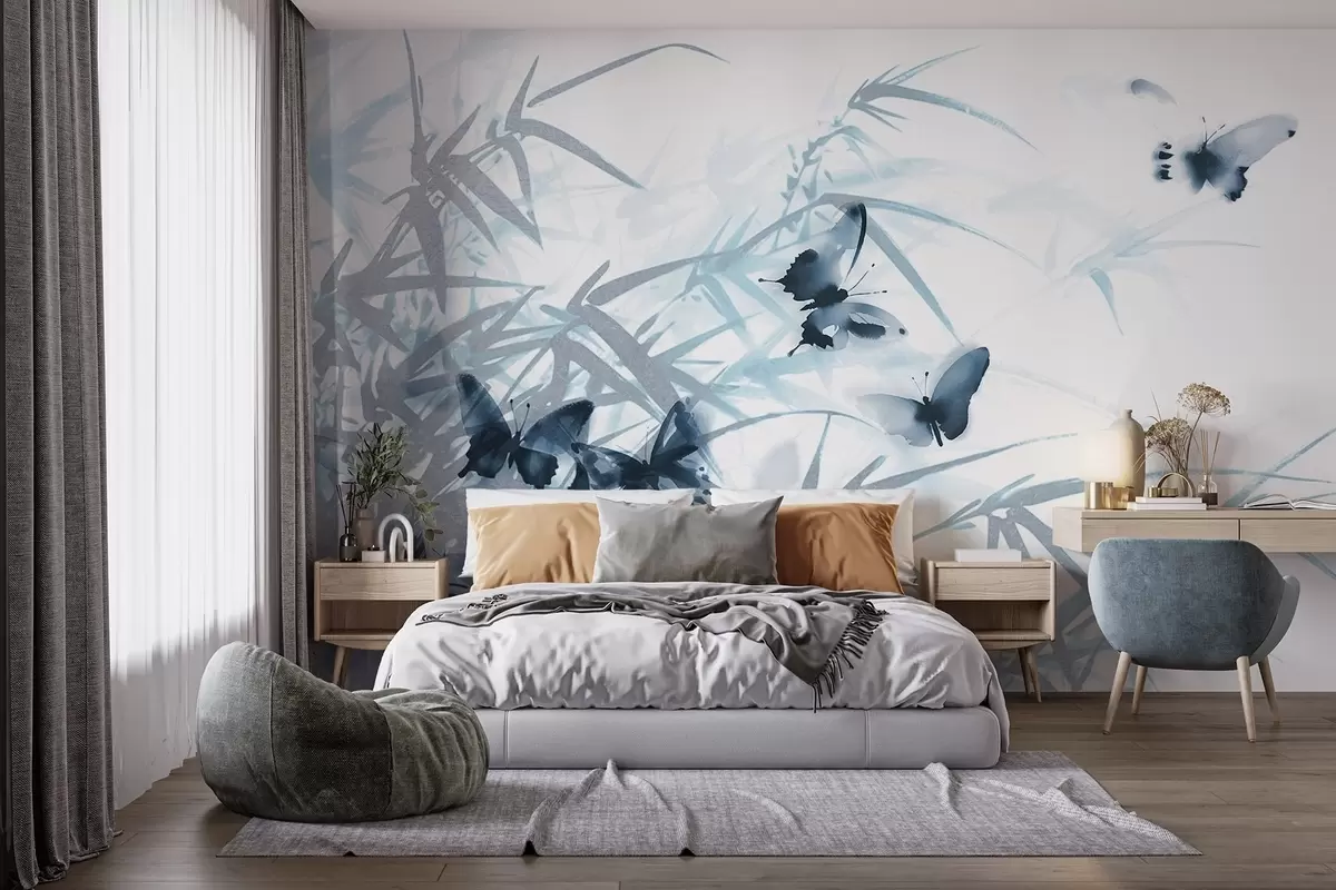 Fototapetai Tekstūriniai bambuko lapai ir stiebai su skraidančiais mėlynais drugeliais skaidriais sparnais Nr. w08524
