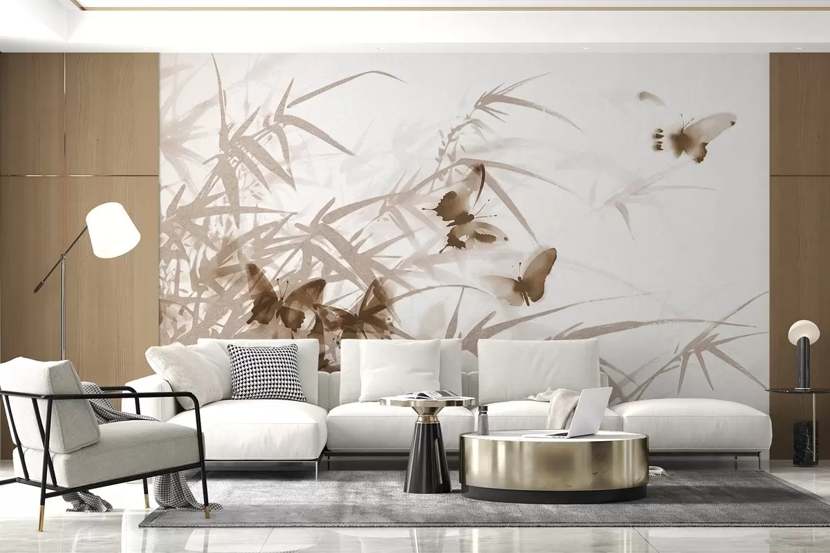 Fototapetai Tekstūriniai bambuko lapai ir stiebai su skraidančiais rudais drugeliais skaidriais sparnais Nr. w08524v1