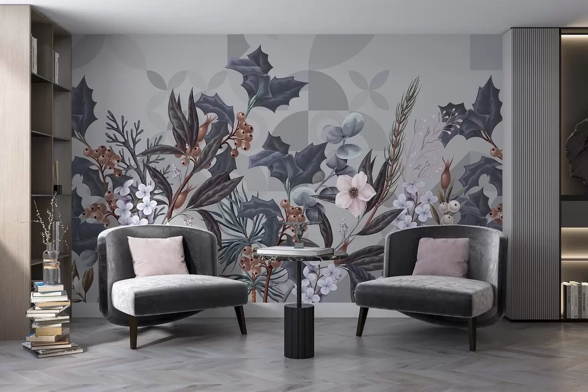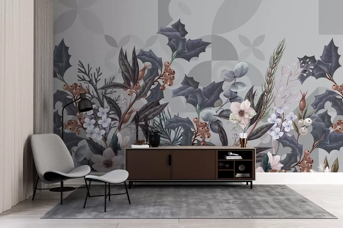 Fototapetai Gėlių kompozicija su dideliais tamsiais lapais, gėlėmis ir uogomis prislopintame pilkame geometriniame abstrakčiame fone Nr. w08525