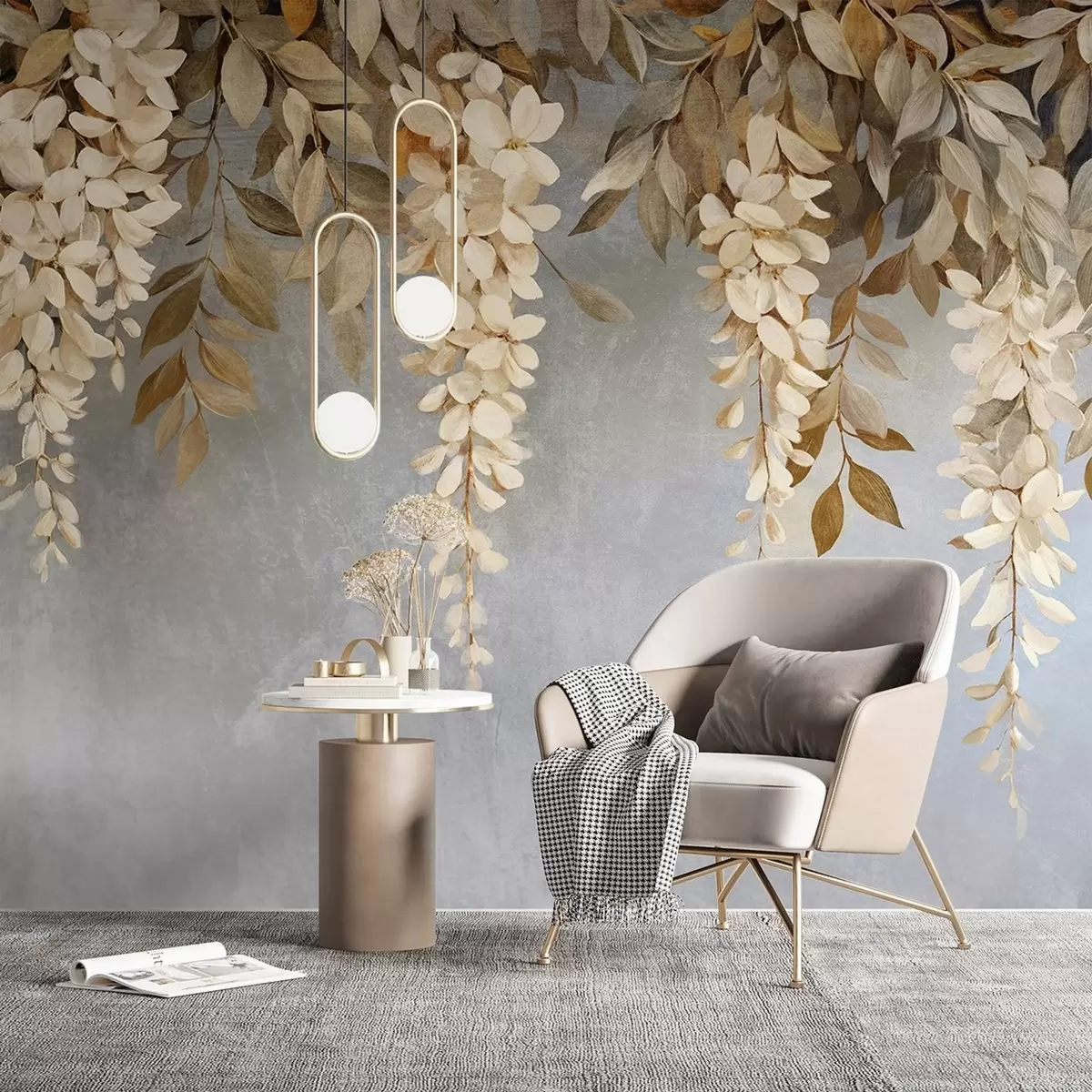 Fototapetai Švelnūs balti ir šviesiai smėlio spalvos visterijos žiedai su lapija kaskadomis žemyn švelniai pilkame fone Nr. w08531
