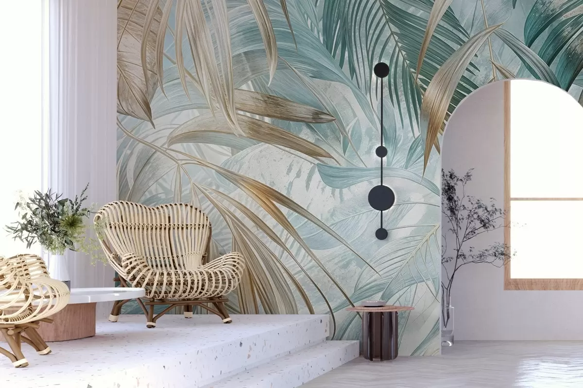 Fototapetai Tropinis abstraktus gėlių raštas su dideliais mėlynos ir smėlio spalvos palmių lapais sukuria sodrią atmosferą Nr. w08532