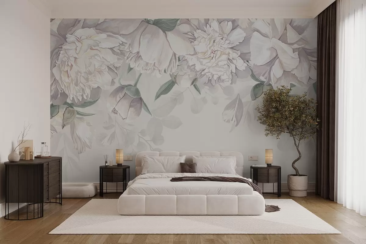 Fototapetai Švelnūs balti ir rausvi pasteliniai bijūnai su žaliais lapais, išdėstyti švelniame, romantiškame gėlių fone Nr. w08577