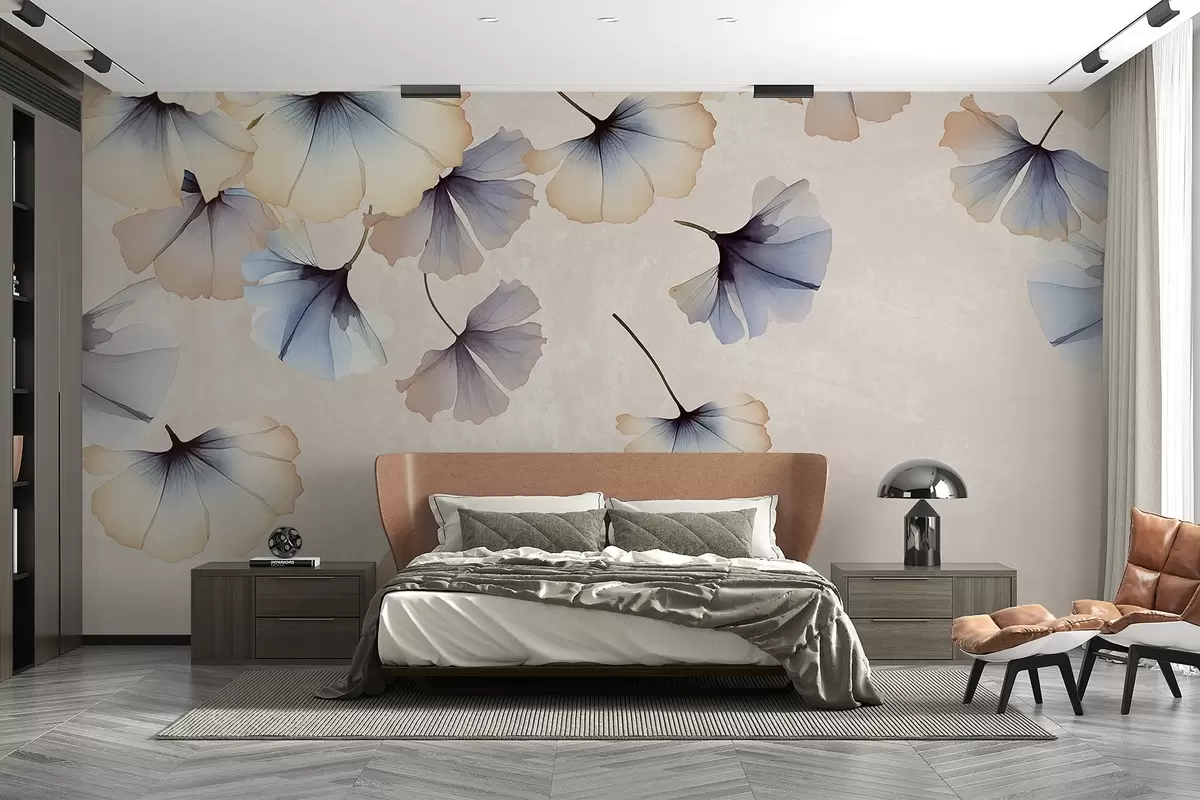 Fototapetai Pastelinių spalvų mėlyni ir smėlio spalvos ginkmedžio lapai su švelniais žiedlapiais, plūduriuojančiais ore tekstūriniame fone Nr. w08578