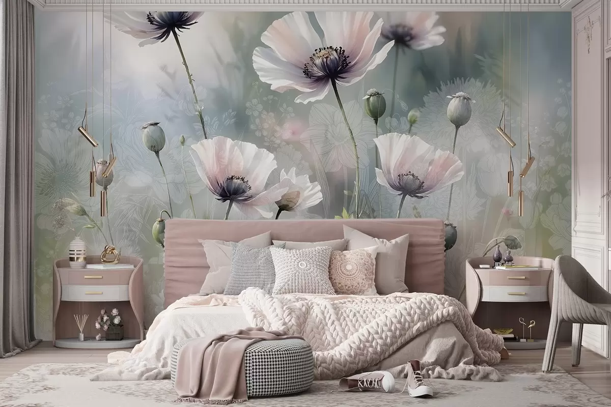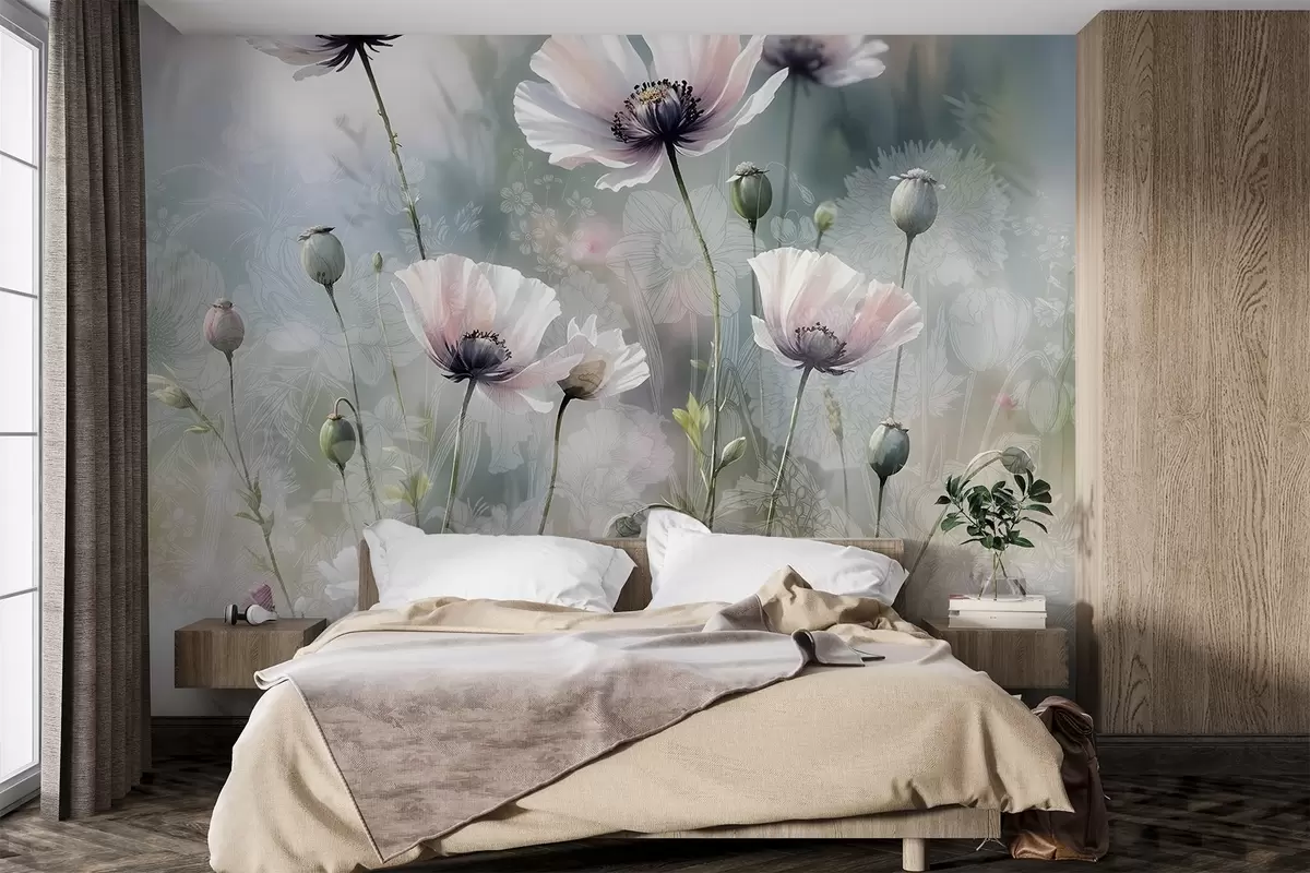 Fototapetai Švelnios rausvos ir violetinės aguonos su žaliais stiebais ir pumpurais švelniame, neryškios tekstūros fone Nr. w08585