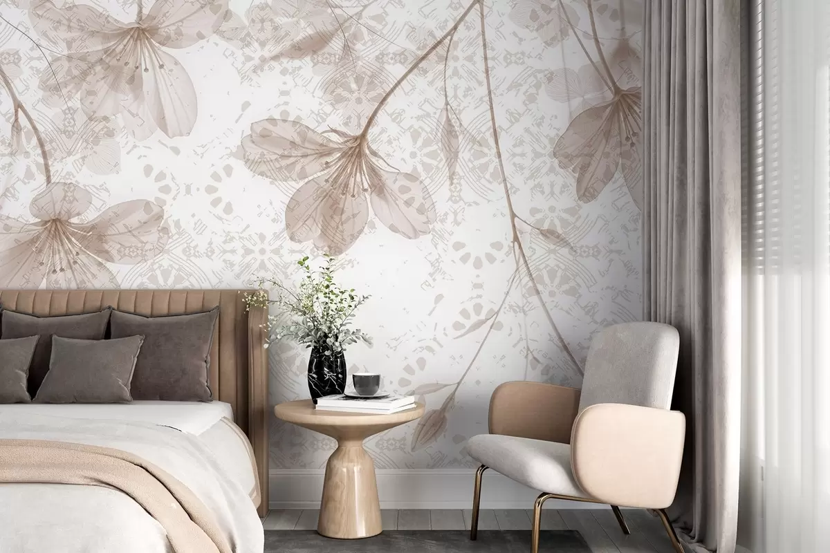 Fototapetai Švelnios smėlio ir baltos spalvos gėlės ilgais stiebais ir žiedlapiais švelniame, neryškiame tekstūriniame fone Nr. w08588v1