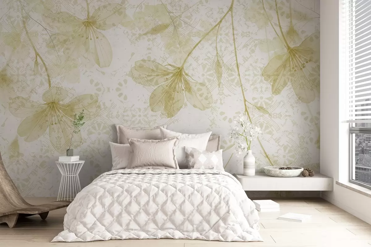 Fototapetai Švelnios geltonos ir baltos gėlės ilgais koteliais ir žiedlapiais švelniame, neryškiame tekstūriniame fone w08588v2