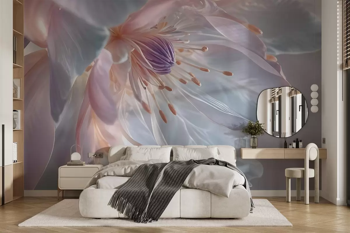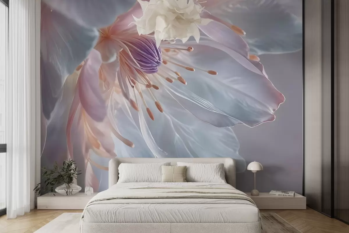 Fototapetai Švelnios pastelinės spalvos gėlės su švelniais, permatomais žiedlapiais ir ryškiu centru stambiu planu Nr. w08605