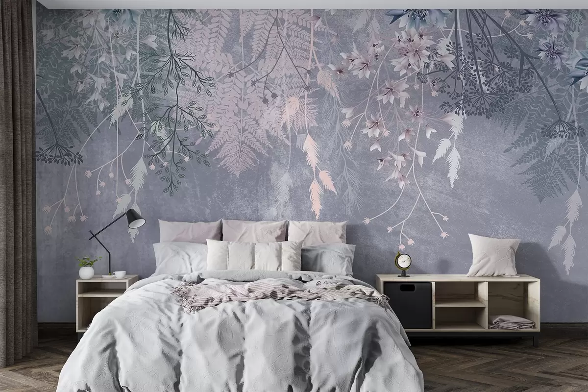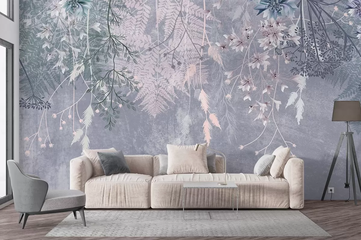 Fototapetai Svajingi, subtilūs, išmintingi augalai, spygliuočiai ir gėlės, mėlynos pastelinės spalvos miglotame, tekstūruotame fone Nr. w08606