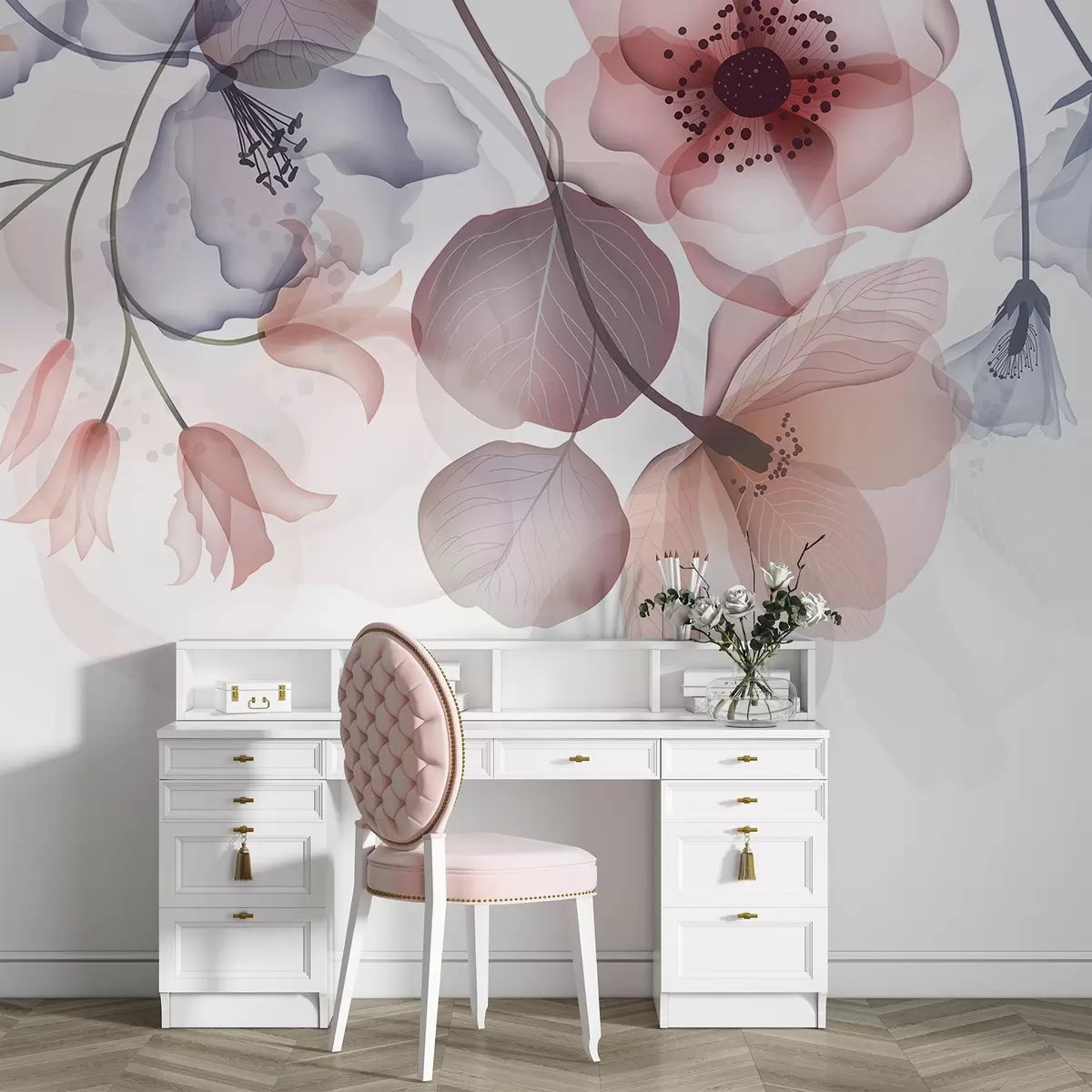 Fototapetai Švelnios rausvos ir pilkos spalvos permatomos gėlės su švelniais žiedlapiais ir tamsiais centrais šviesiame fone Nr. w08613