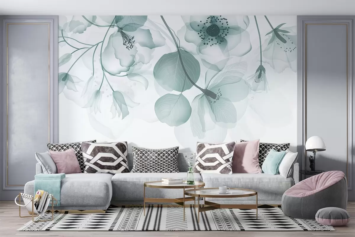 Fototapetai Švelnios prislopintos turkio spalvos permatomos gėlės su švelniais žiedlapiais ir tamsiais centrais šviesiame fone Nr. w08613v1