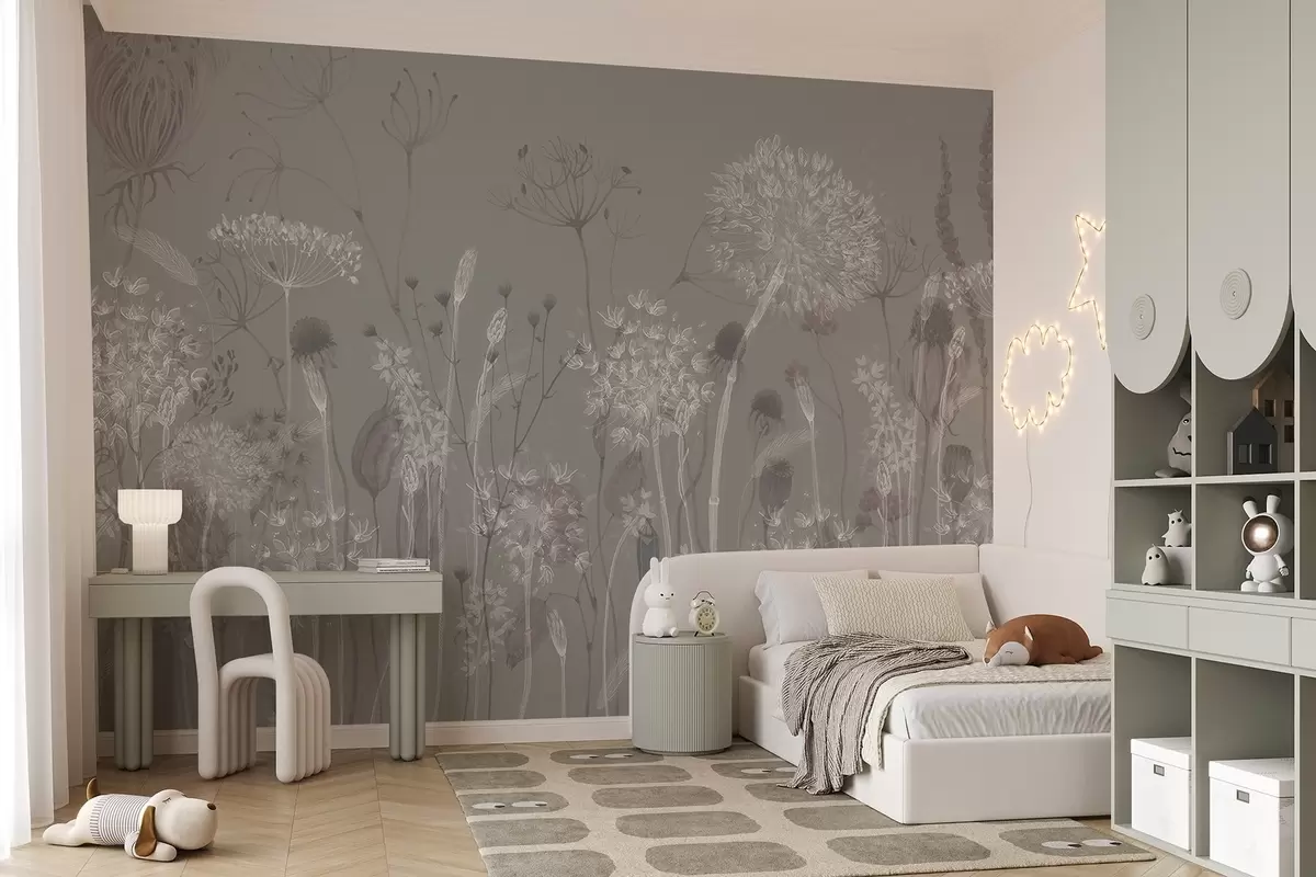 Fototapetai Akvarelės stiliumi sukurtos mėlynai pilkų tonų pienės ir laukinės gėlės Nr. w08637v3