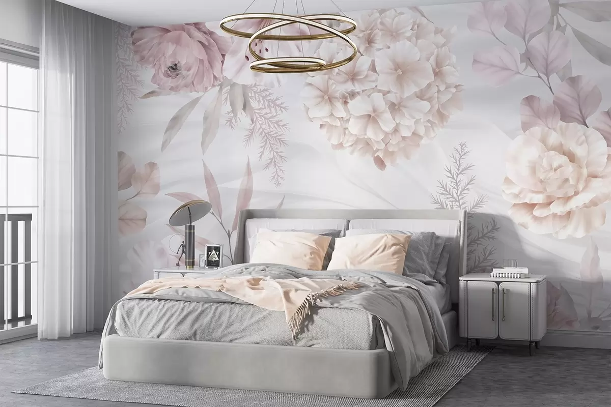 Fototapetai Švelnus, abstraktus gėlių raštas su didelėmis rausvomis ir baltomis gėlėmis, subtiliais lapais ir prislopinta pastelinių spalvų palete Nr. w08651