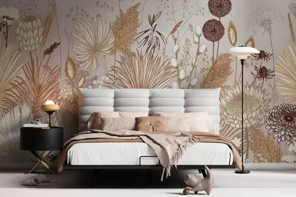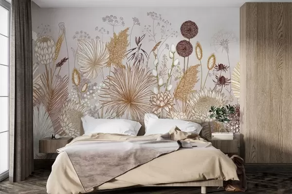 Fototapetai Šiltų smėlio atspalvių botaninio stiliaus gėlės ir augalai, demonstruojantys įvairias formas ir tekstūras Nr. w08672