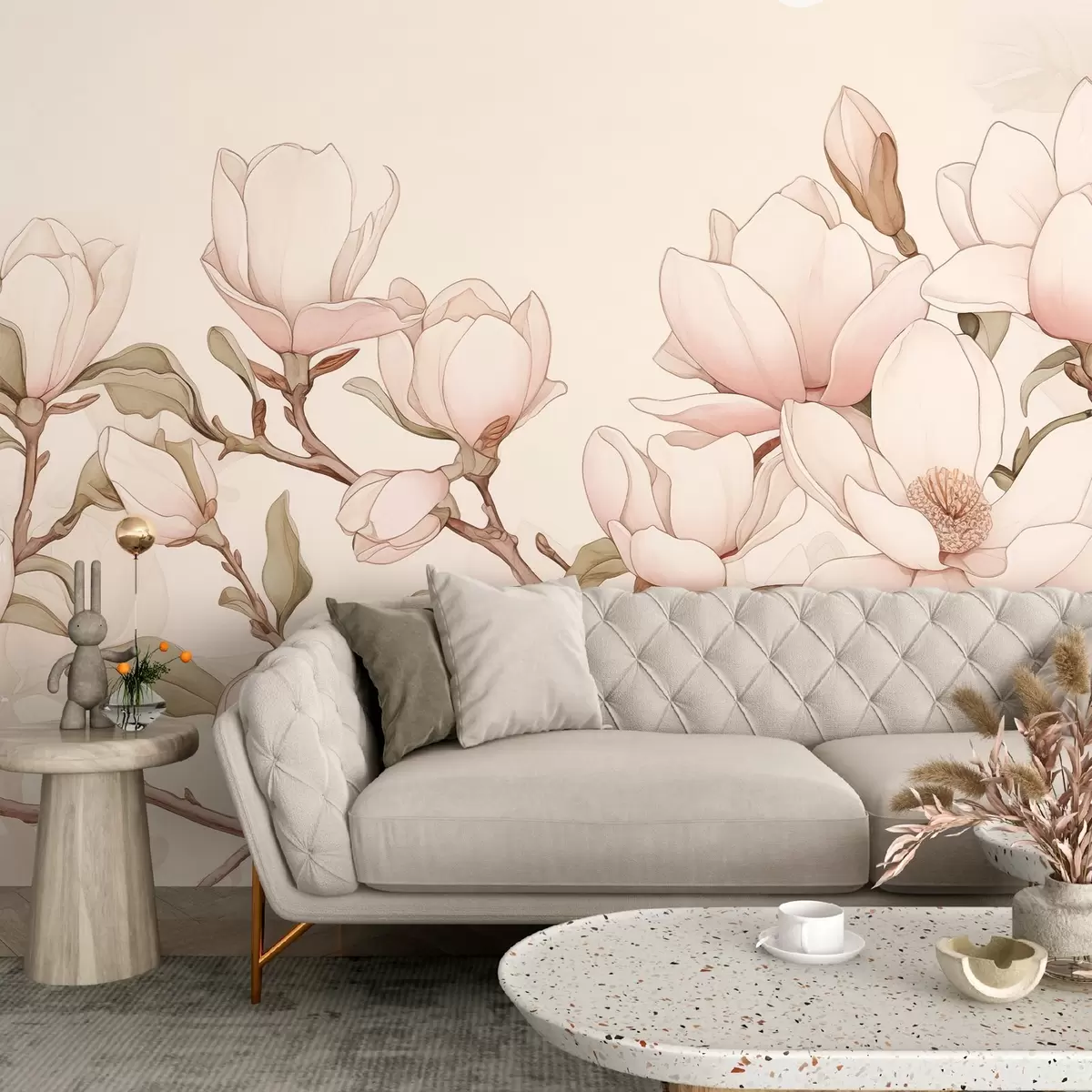 Fototapetai Magnolijos šakos su švelniais rausvais žiedais šviesiame fone sukuria rafinuotą ir ramią atmosferą Nr. w08688