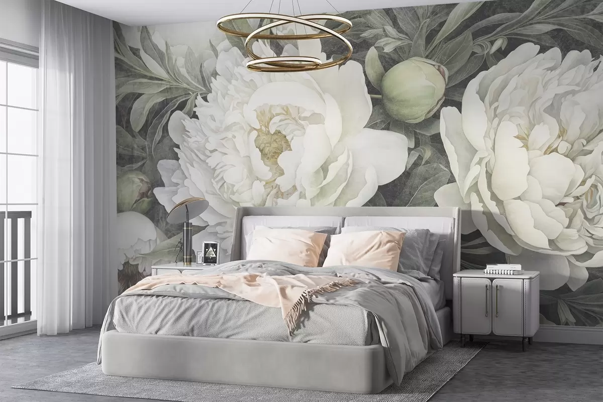Fototapetai Tekstūriniai pasteliniai balti bijūnai su švelniai žaliais pumpurais ir lapeliais su švelniais žiedlapiais Nr. w08697