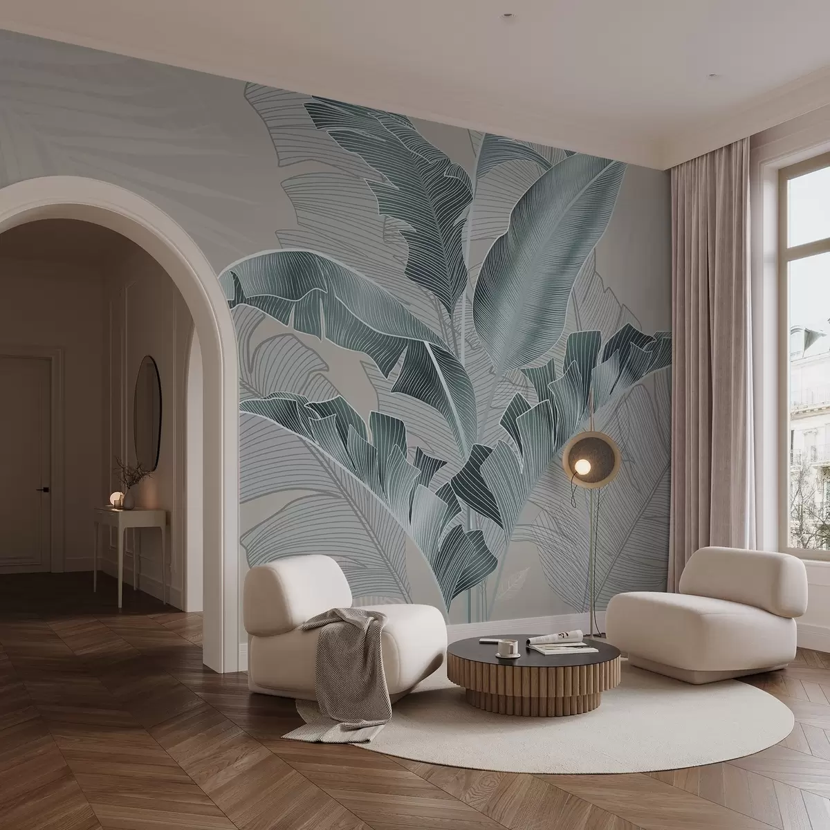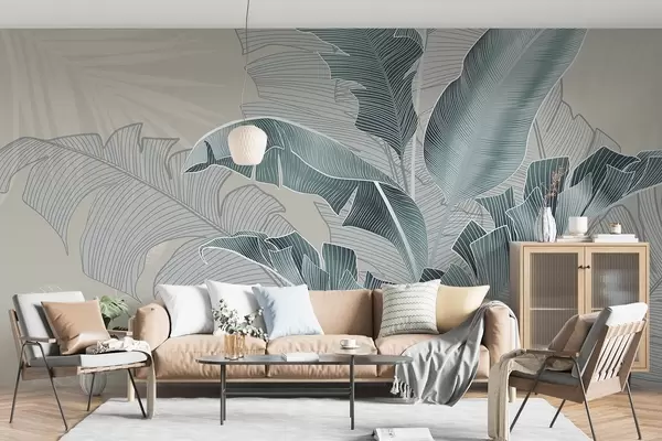 Fototapetai Darni smėlio ir turkio atspalvių atogrąžų lapų kompozicija su detaliais linijų piešiniais Nr. w08698v1