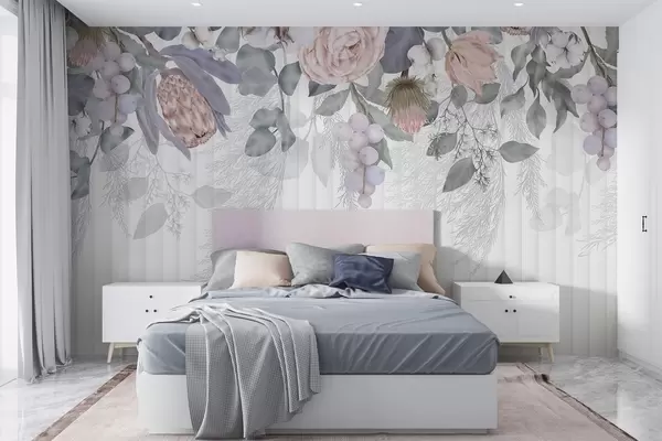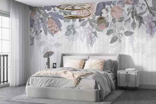 Fototapetai Gėlių pastelinių spalvų rožinės rožės, protea gėlės, eukalipto šakelės ir uogos tekstūriniame fone Nr. w08700