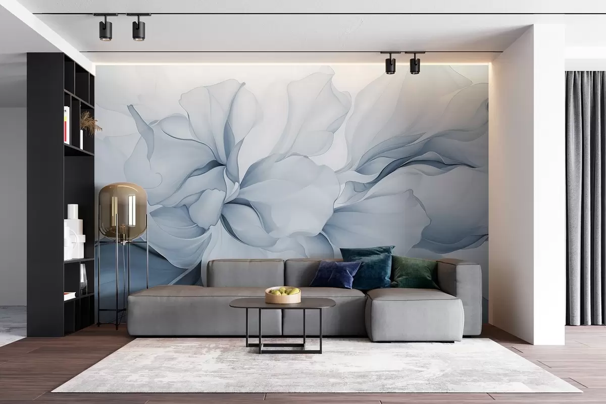 Fototapetai Tekančios abstrakčios gėlių žiedlapių permatomos ir sluoksniuotos formos pastelinėmis spalvomis, mėlynais atspalviais Nr. w08701v2