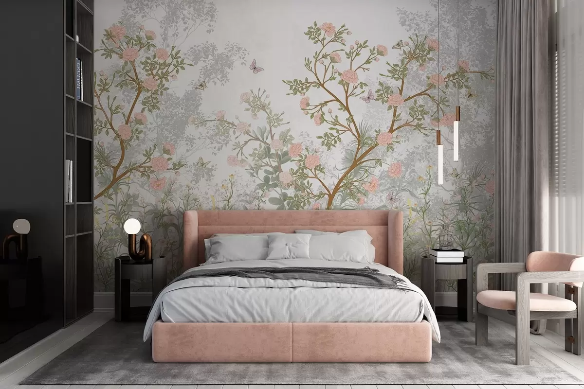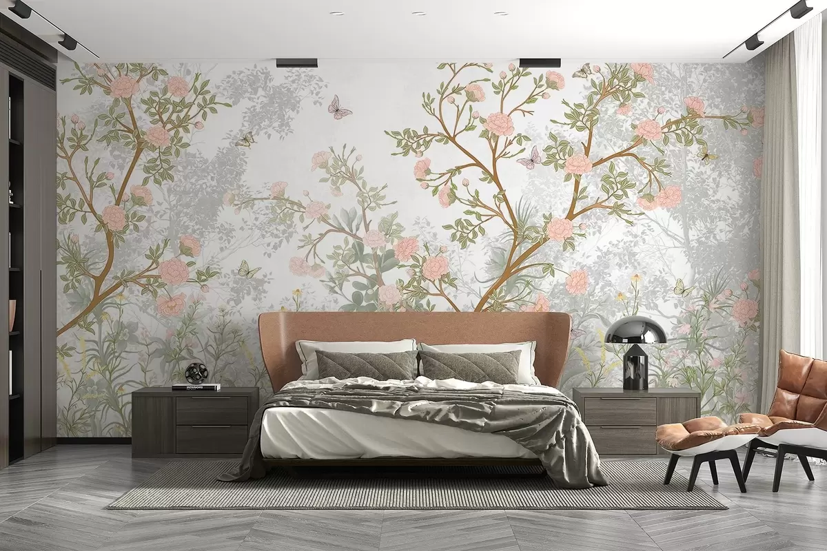 Fototapetai Švelniai rausvai žydintys medžiai, skraidantys drugeliai ir žali lapai, susipynę su lieknomis šakomis Nr. w08744