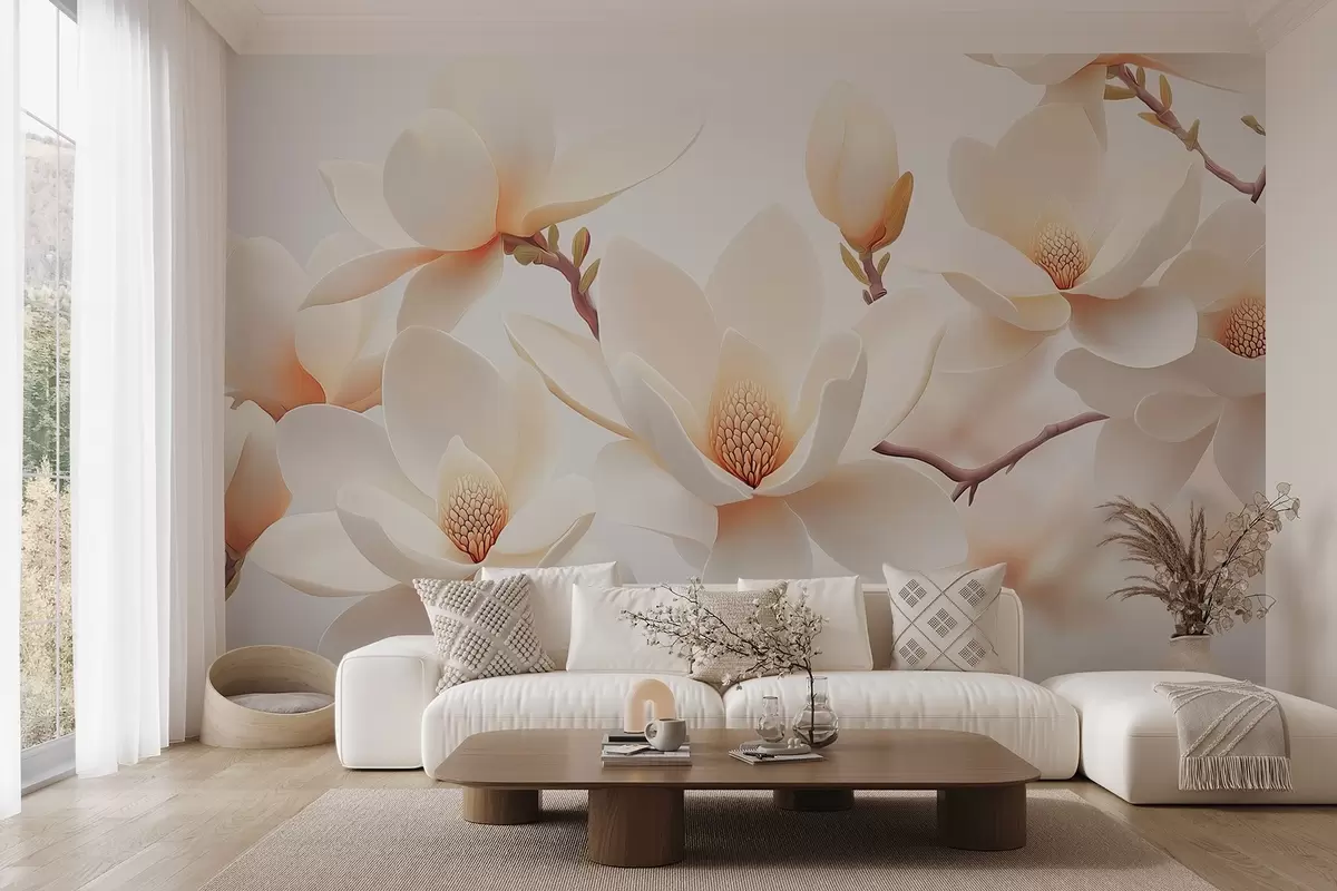 Fototapetai Žydinčios kreminės spalvos magnolijos žiedai baltame fone Nr. w08745