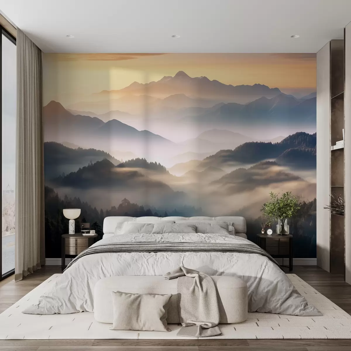 Fototapetai Ramus kalnų kraštovaizdis auštant, kai pušis apgaubia švelnus rūkas Nr. w08748