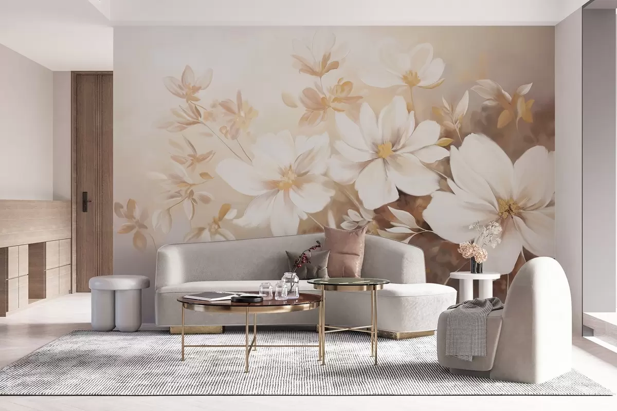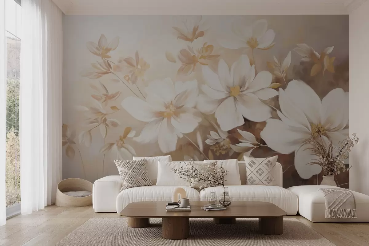 Fototapetai Baltai dažytos gėlės su švelniais žiedlapiais ir subtiliais lapeliais šviesiai smėlio ir kreminės spalvos fone Nr. w08780