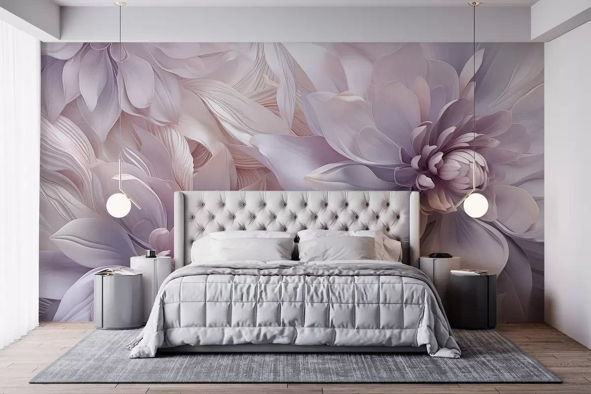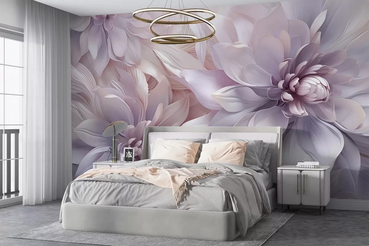 Fototapetai Švelnios, sluoksniuotos šviesiai rožinės, levandų ir baltos spalvos gėlės su švelniais žiedlapiais ir sudėtingomis detalėmis Nr. w08783