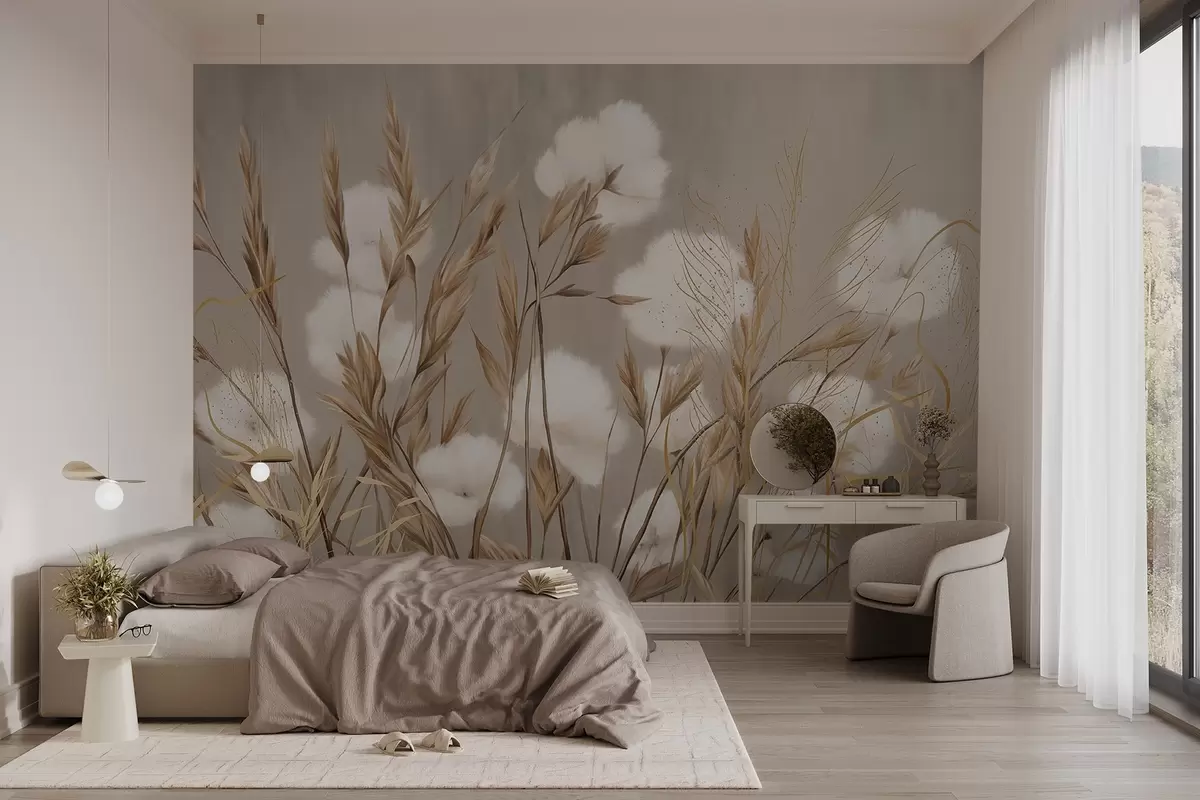 Fototapetai Minkštos, purios medvilninės baltos gėlės ir aukštos oranžinės spygliuotos žolės prislopintos tekstūros smėlio spalvos fone Nr. w08784