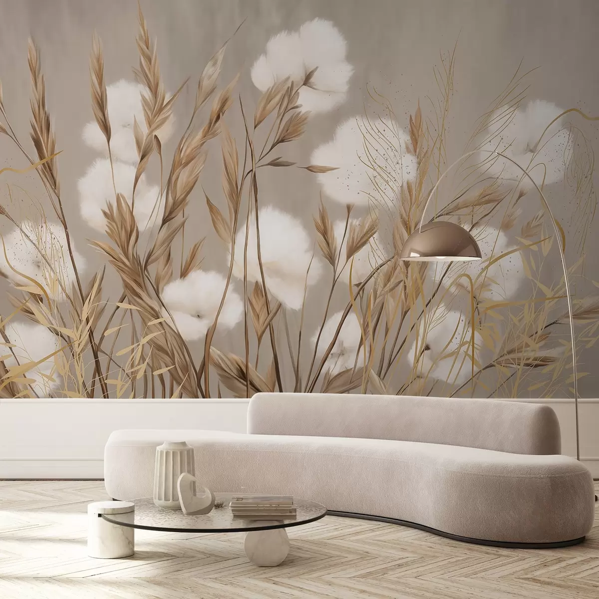 Fototapetai Minkštos, purios medvilninės baltos gėlės ir aukštos oranžinės spygliuotos žolės prislopintos tekstūros smėlio spalvos fone Nr. w08784