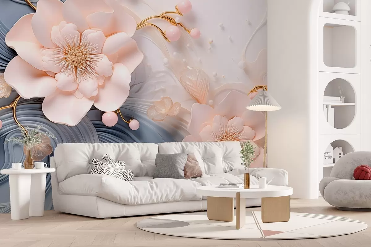 Fototapetai 3D fono dizainas su rausvomis gėlėmis ir perlais ant mėlynų ir baltų bangų Nr. w08806