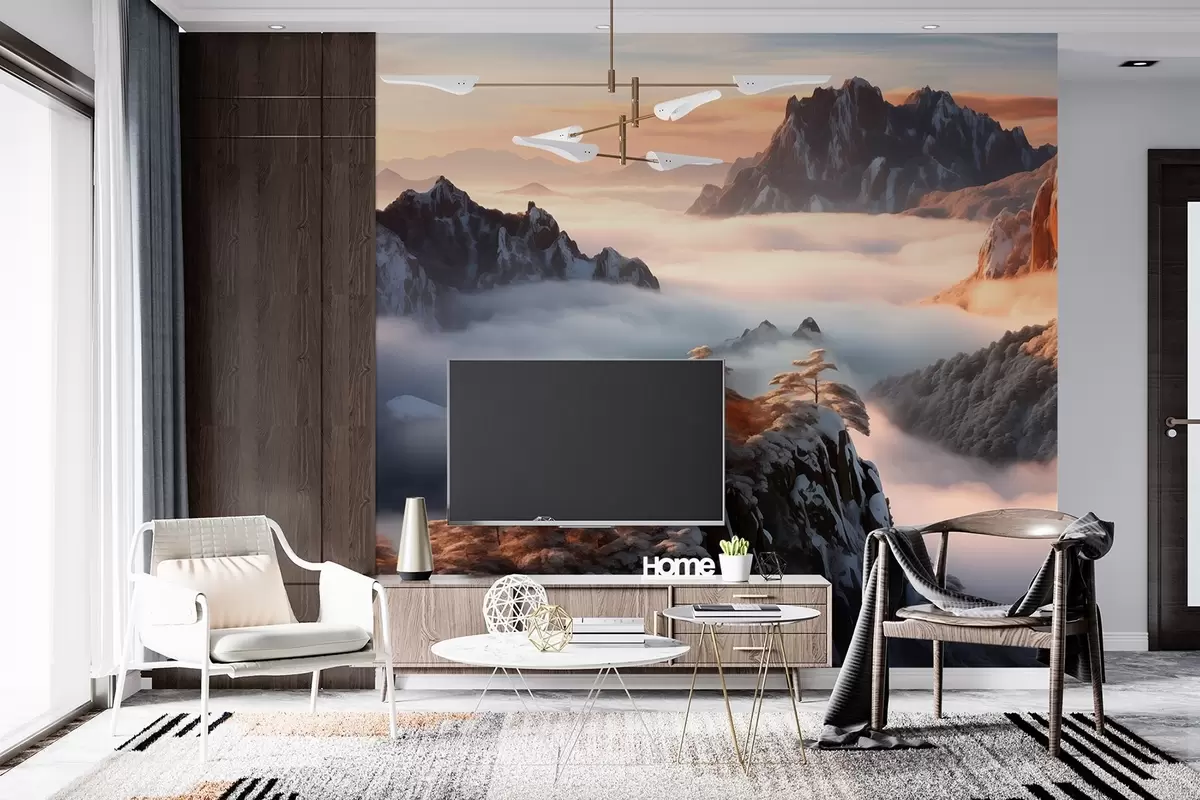 Fototapetai Žavingas kalnų kraštovaizdis su rūku ir medžiais Nr. w08807
