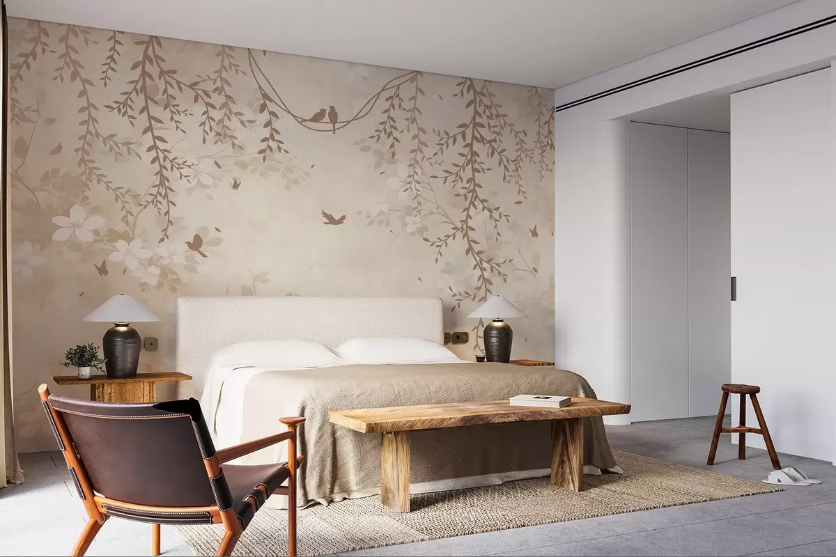 Fototapetai Paukščiai su kabančiais augalais ir gėlių raštu šviesiai smėlio ir kreminės spalvos atspalviais Nr. w08809
