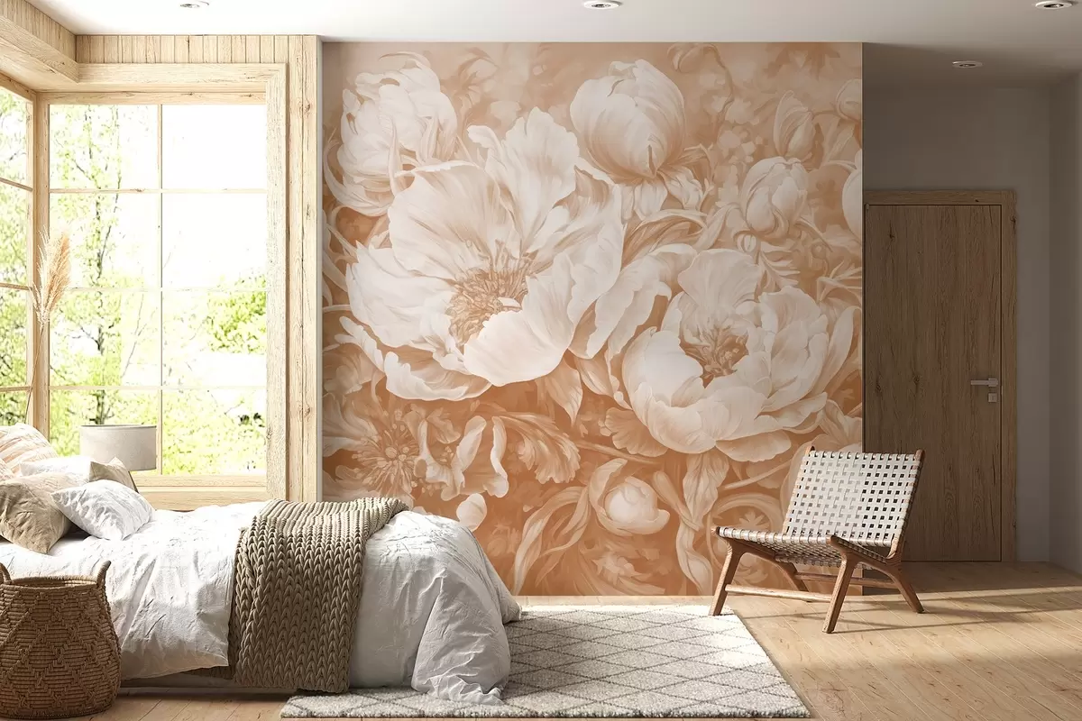 Fototapetai Tulpės ir bijūnai, gėlių kompozicija smėlio spalvos aliejiniais potėpiais Nr. w08817v1