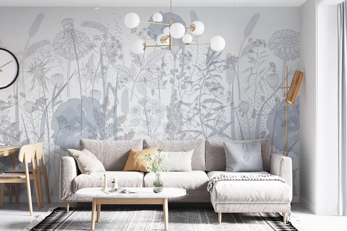 Fototapetai Aukštų gėlių ir žolės laukas šviesiai mėlynais pasteliniais tonais baltame fone Nr. w08829