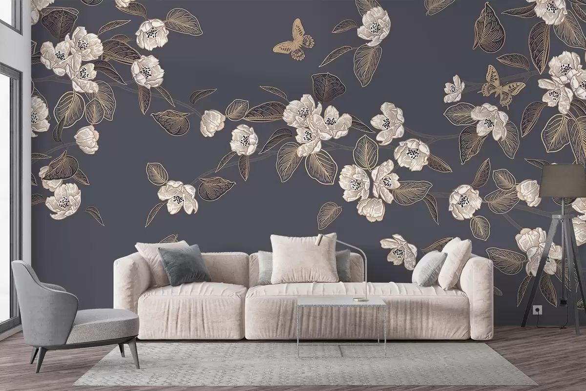 Fototapetai Vyšnios medžio šakelė su gėlėmis, lapais, drugeliais tamsiai pilkame fone w08830