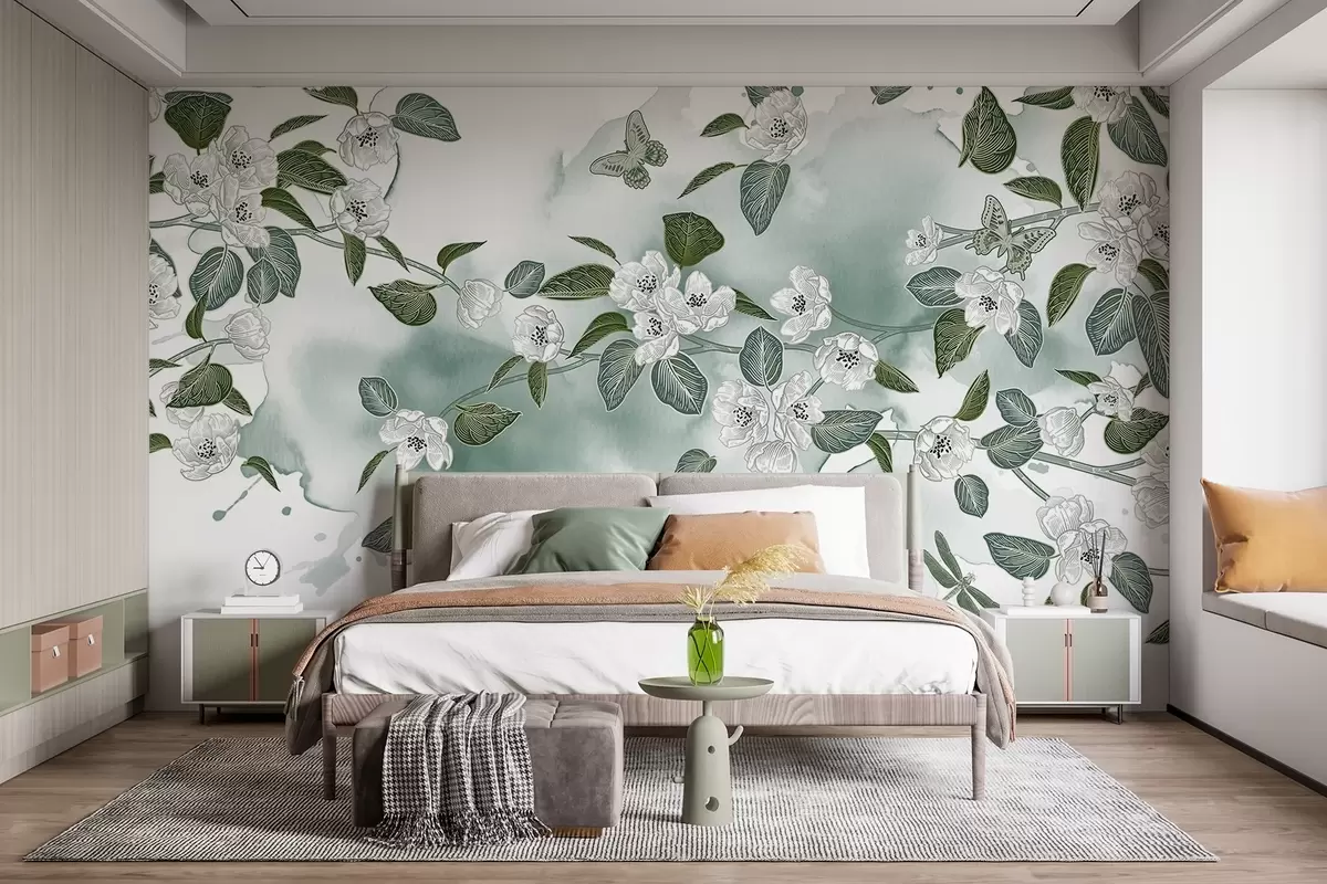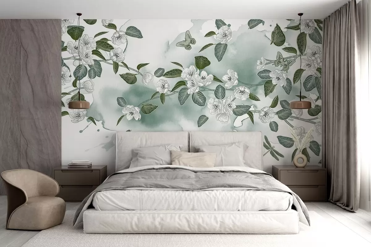 Fototapetai Vyšnios medžio žiedų šaka su gėlėmis, lapais, drugeliais šviesiai žaliame akvareliniame tekstūruotame fone Nr. w08831