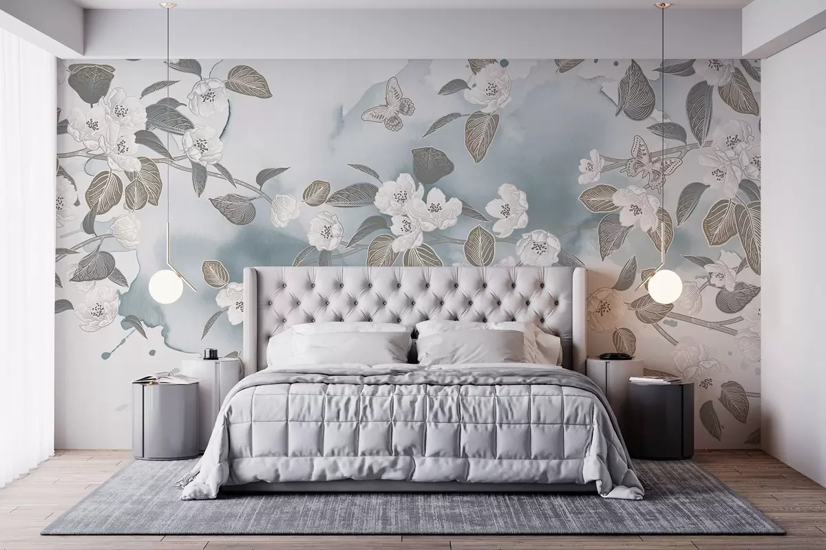 Fototapetai Vyšnios medžio žiedų šaka su gėlėmis, lapais, drugeliais šviesiai mėlyname akvareliniame tekstūruotame fone Nr. w08831v1