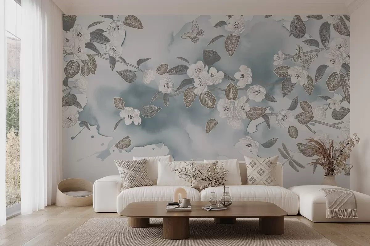 Fototapetai Vyšnios medžio žiedų šaka su gėlėmis, lapais, drugeliais šviesiai mėlyname akvareliniame tekstūruotame fone Nr. w08831v1