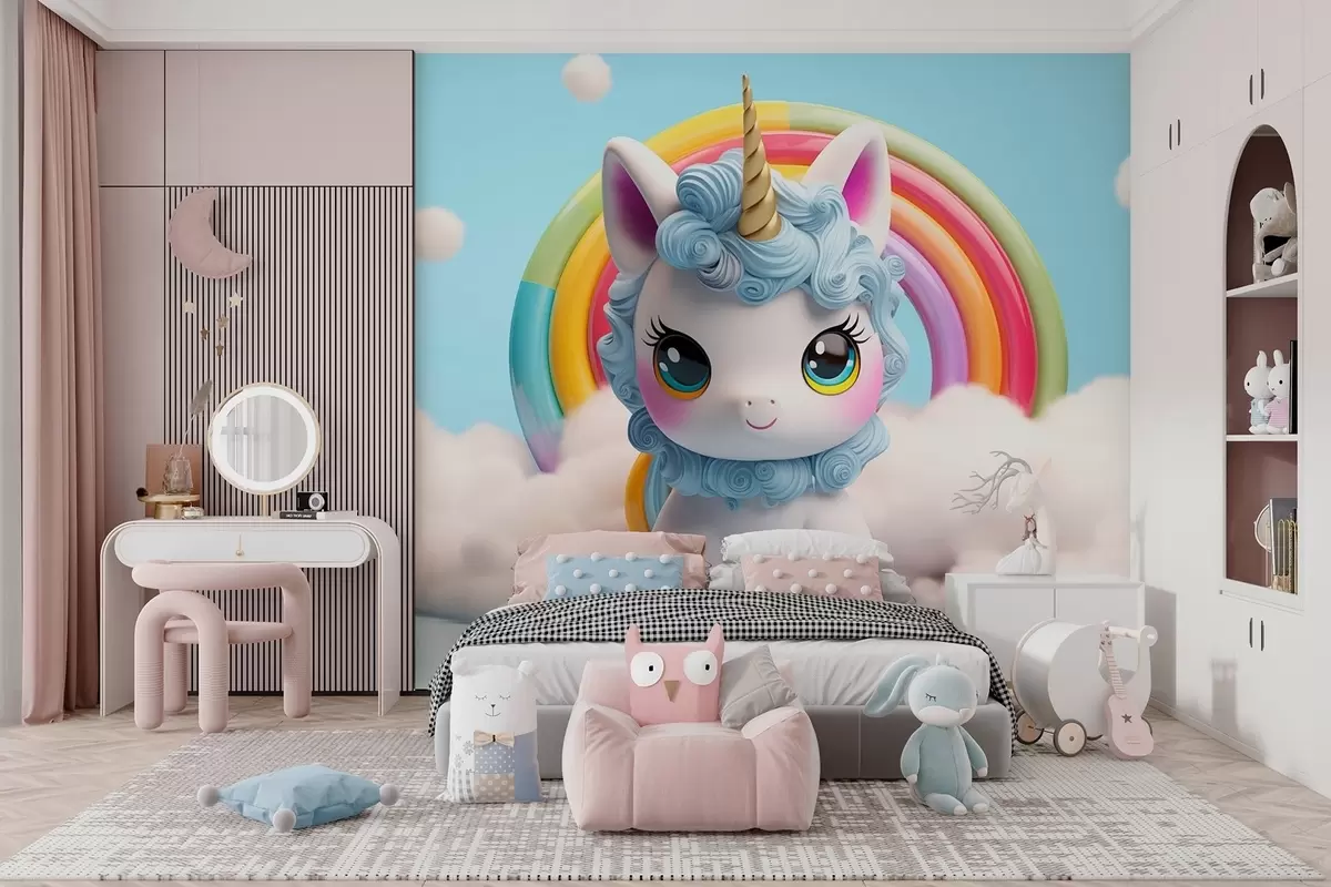 Fototapetai 3D mielas vienaragis, apsuptas debesų ir vaivorykštės Nr. w08848