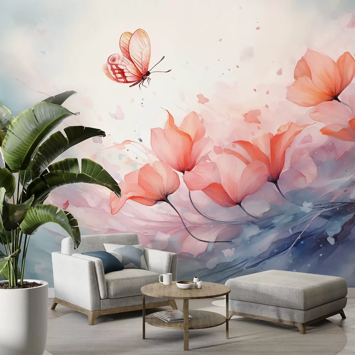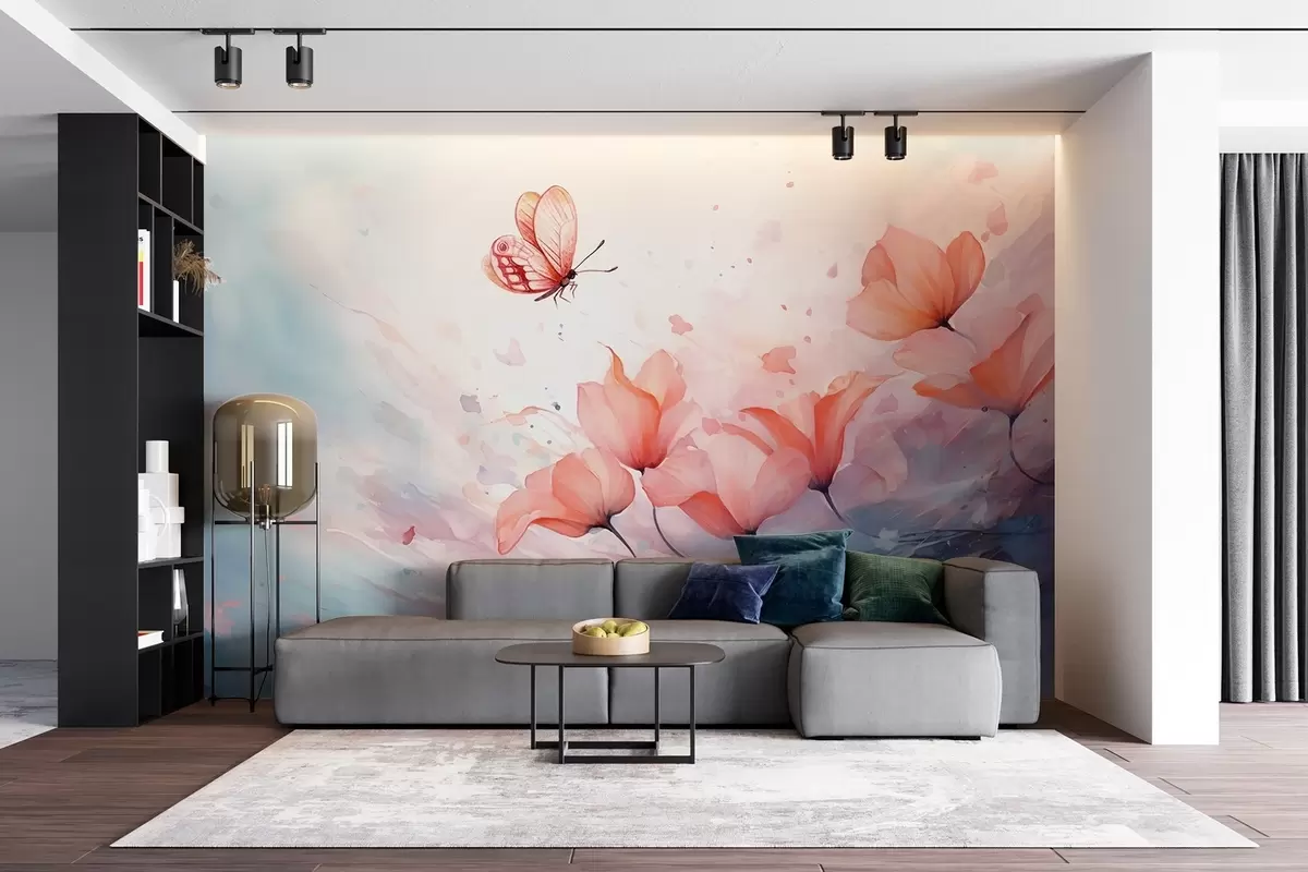 Fototapetai Akvarelės stiliaus subtilios aguonos su drugeliu Nr. w08849