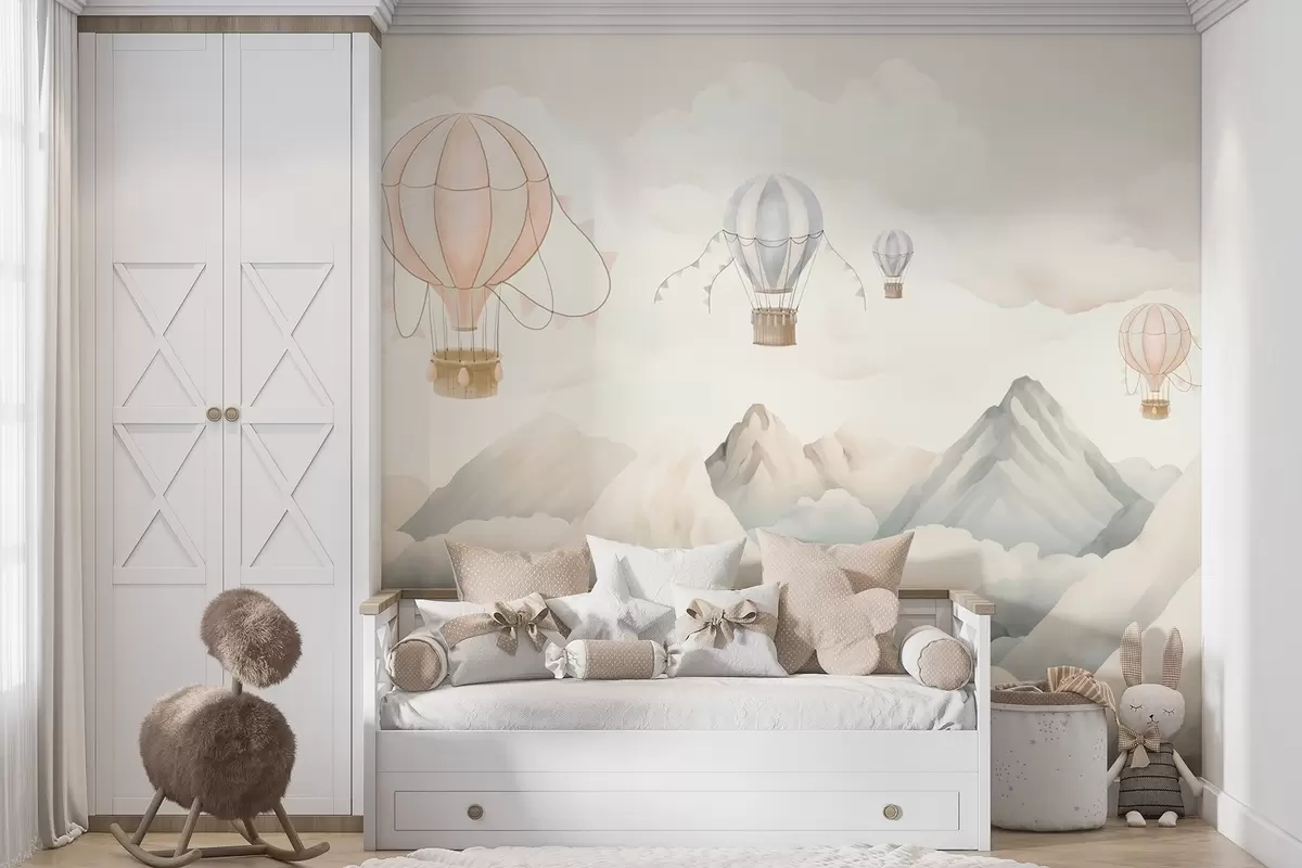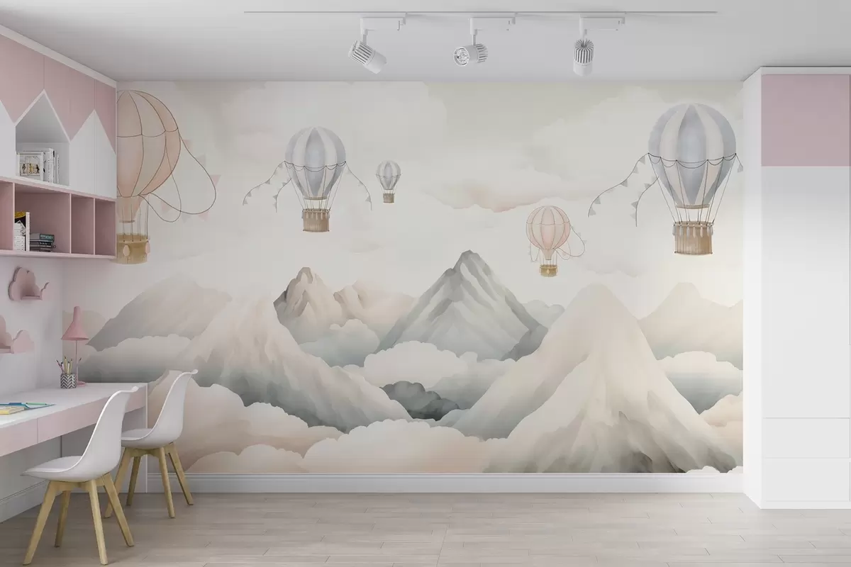 Fototapetai Neutralių, švelnių pastelinių tonų karšto oro balionai, sklendžiantys virš kalnų Nr. w08853