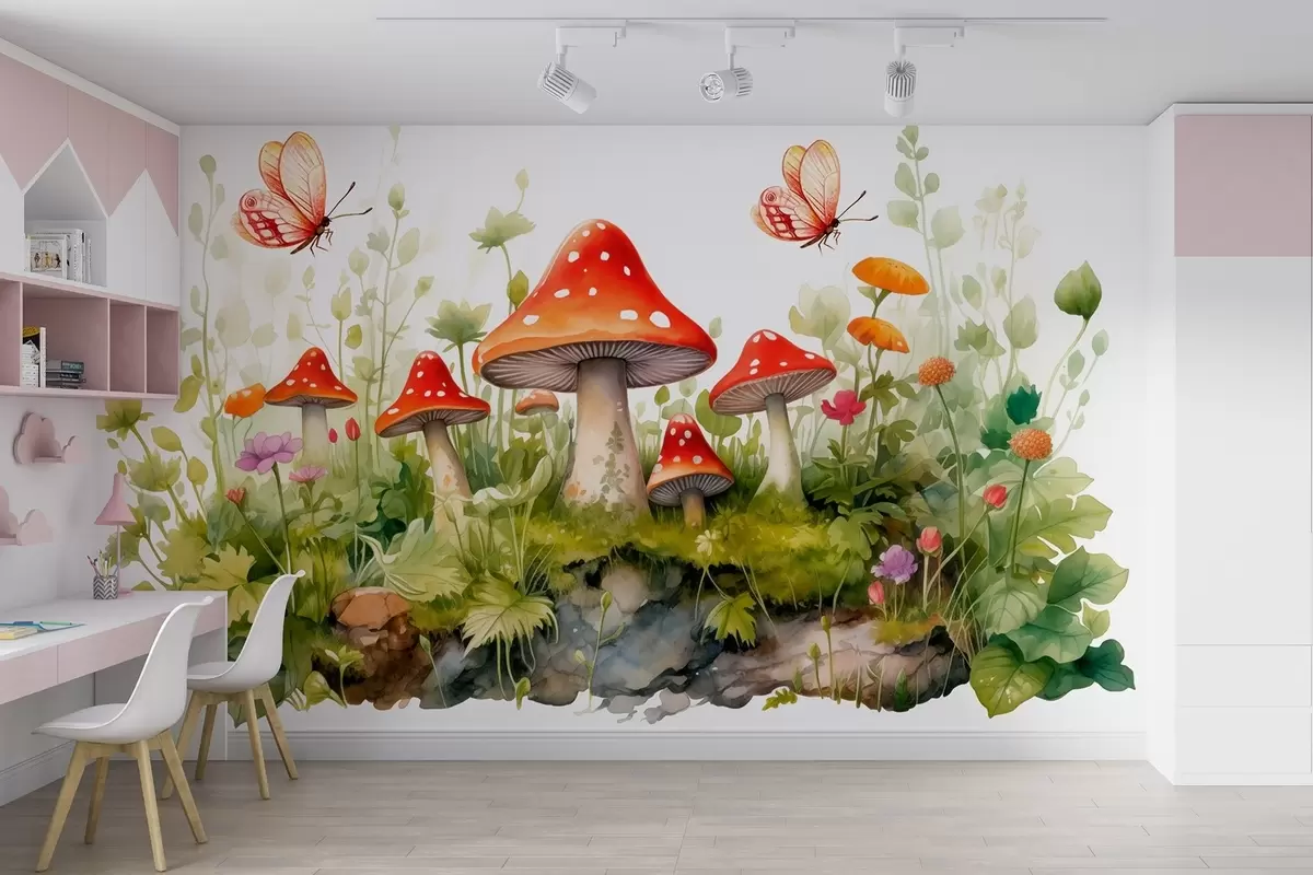 Fototapetai Akvarelės stiliaus miško kraštovaizdis baltame fone su grybais, varlėmis ir drugeliais Nr. w08854