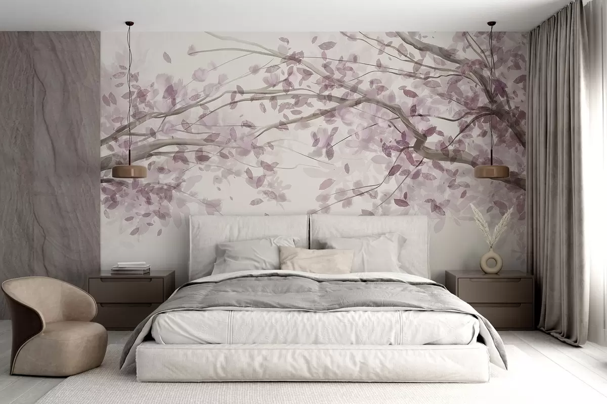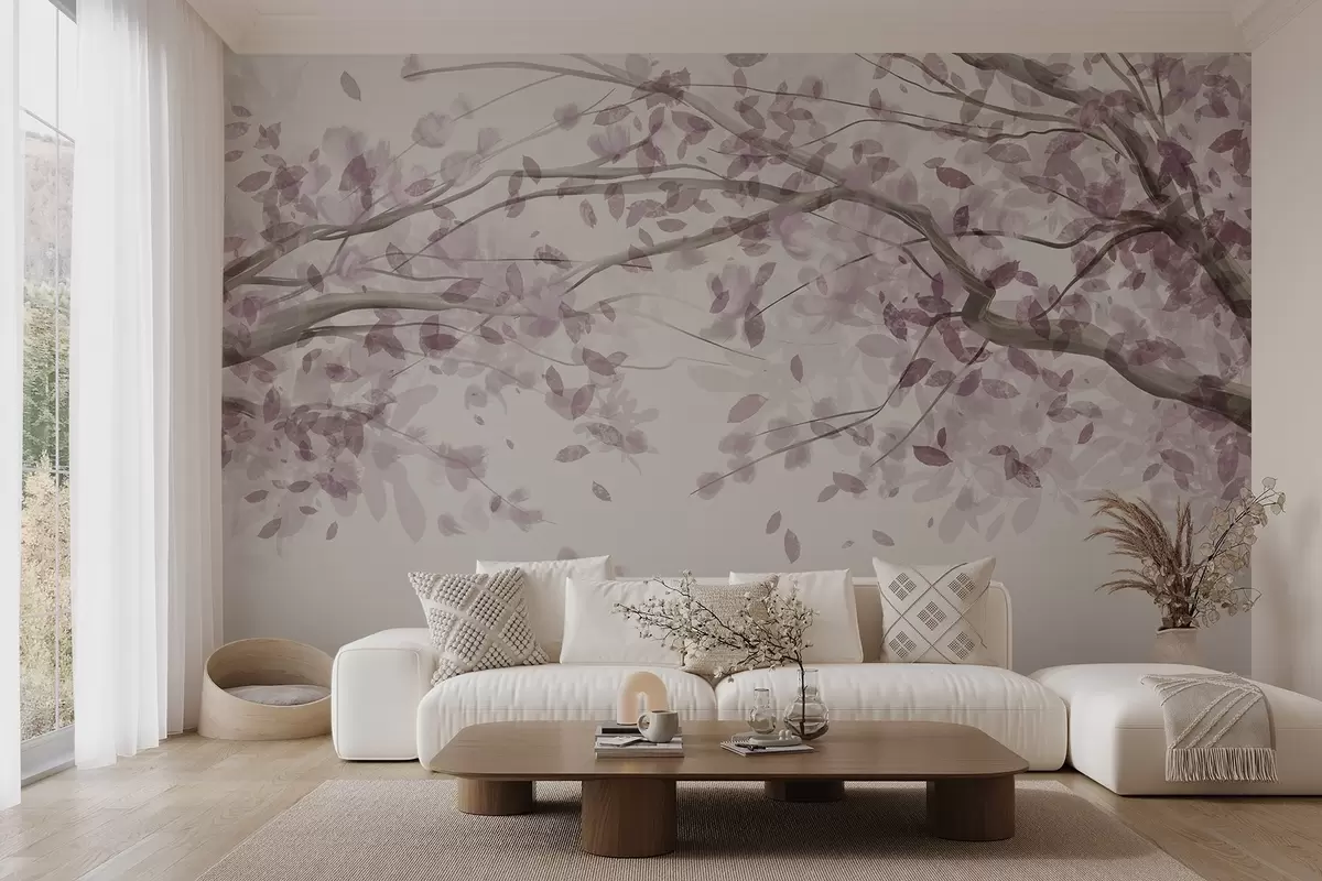 Fototapetai Žiedų šakos su rožiniais lapais, švelnios spalvos, subtilios detalės, akvarelės stilius, šviesiame fone Nr. w08867