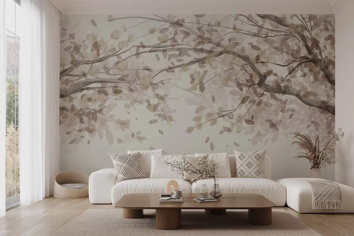 Fototapetai Žiedų šakos su smėlio spalvos lapais, švelnios spalvos, subtilios detalės, akvarelės stilius, šviesiame fone Nr. w08867v1