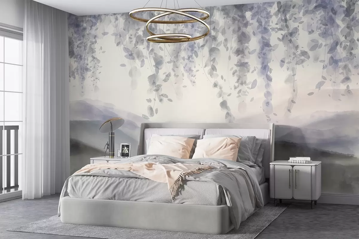 Fototapetai Visterijos lapai, kabantys virš melsvų kalnų, švelnios pastelinės mėlynos ir pilkos spalvos, akvarelės stiliaus kraštovaizdis w08909